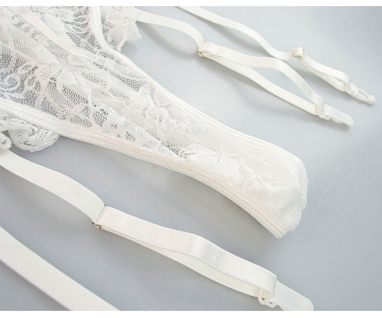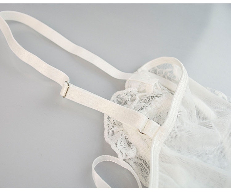Seductive White Mesh See-Through Lingerie Set: Alluring Underwear with Thong, Perfect for Intimate Occasions.